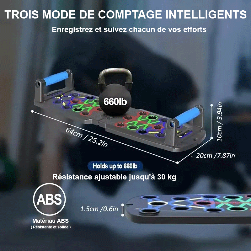 La SmartFit™ supporte jusqu'à 150 kg grâce à sa construction en ABS renforcé de qualité militaire. Conçue pour résister aux entraînements les plus intenses !