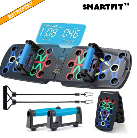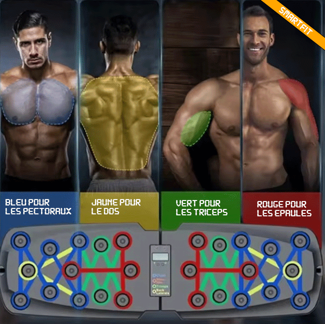 La SmartFit™ utilise un système de codes couleurs et de positions prédéfinies pour cibler différents groupes musculaires. Placez simplement vos mains sur les positions indiquées selon l'exercice souhaité. Le design intelligent guide automatiquement vos mouvements pour une forme parfaite !